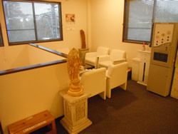 複数の葬儀が重なった際に使用するもう一つの待合室には一見線で描かれているように見えるが、よく見ると細かな文字で般若心経が書かれている菩薩の絵が飾られています。白い和紙に描かれたシンプルな菩薩ですが、厳かな雰囲気のある部屋にとても良く合っていました。来園の際はぜひご覧になってみて下さい。
