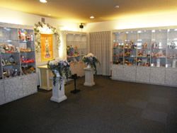 1F受付を通るとメモリアルグッズの展示スペースがあります。かわいらしいバスケットの棺などがあり、ペットとのお別れにお好みのグッズを選ぶことができます。1Fロビーの隣が火葬室です。暖色の照明がお別れの雰囲気を演出しています。炉前や祭壇にお花が飾られていて、愛するペットを華やかに送ることができます。