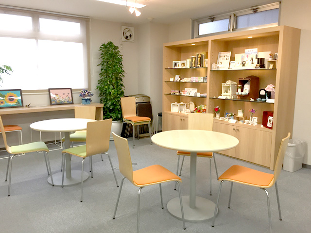 ビルの2階に斎場、納骨堂、待合室、メモリアルグッズコーナーがありゆっくりくつろぐこともできます。